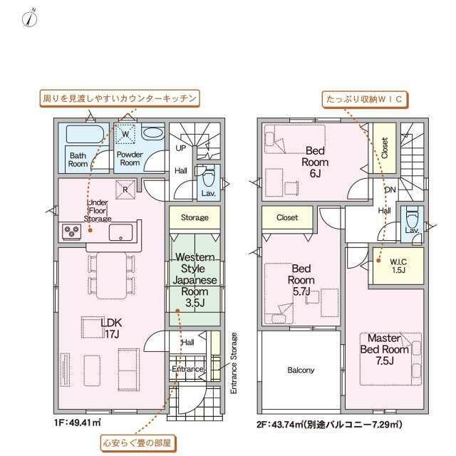 号棟番号:1号棟 建物面積に別途ルーフバルコニー約7.29平米有り 駐車場2台(車種による) 敷地内擁壁有り |